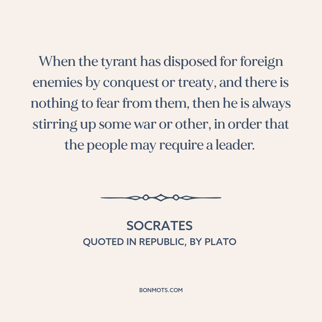 When the tyrant has disposed for foreign enemies by conquest or treaty, and there is nothing to fear from them, then he is always stirring up some war or other, in order that the people may require a leader.