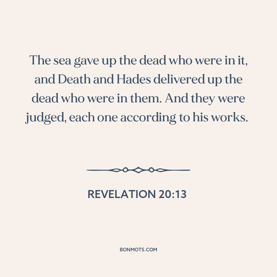 καὶ ἔδωκεν ἡ θάλασσα τοὺς νεκροὺς τοὺς ἐν αὐτῇ, καὶ ὁ θάνατος καὶ ὁ Ἅιδης ἔδωκαν τοὺς νεκροὺς τοὺς ἐν αὐτοῖς, καὶ ἐκρίθησαν ἕκαστος κατὰ τὰ ἔργα αὐτῶν.