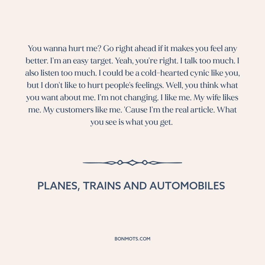 You wanna hurt me? Go right ahead if it makes you feel any better. I'm an easy target. Yeah, you're right. I talk too much. I also listen too much. I could be a cold-hearted cynic like you, but I don't like to hurt people's feelings. Well, you think what you want about me. I'm not changing. I like me. My wife likes me. My customers like me. 'Cause I'm the real article. What you see is what you get.