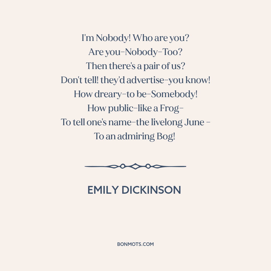 Dickinson, Emily. "I'm Nobody! Who are you?" Poems by Emily Dickinson: Second Series. Boston: Roberts Brothers, 1891, I. 1.