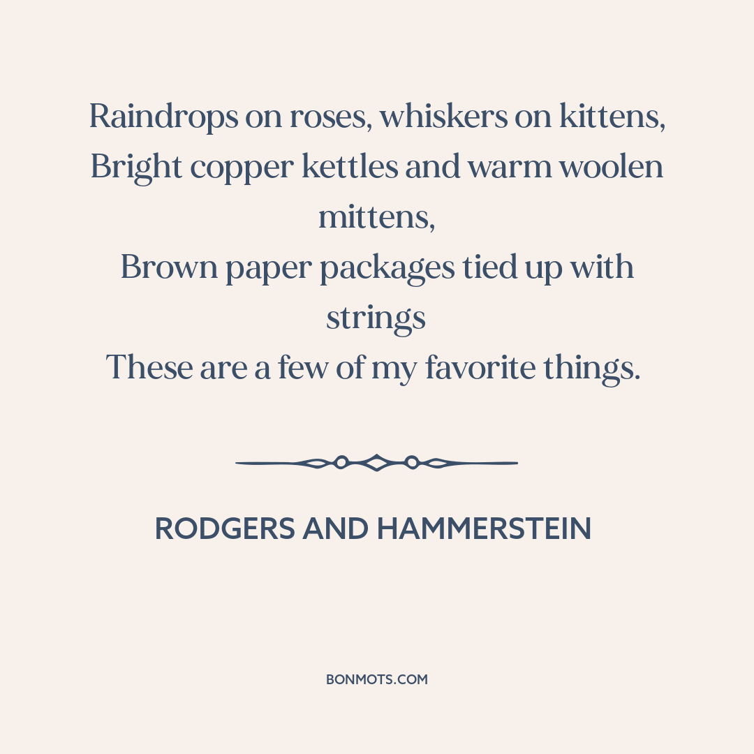 Hammerstein, Oscar, II. "My Favorite Things." The Sound of Music. Composed by Richard Rodgers. 1959, Shubert Theatre, New Haven, Connecticut, USA.