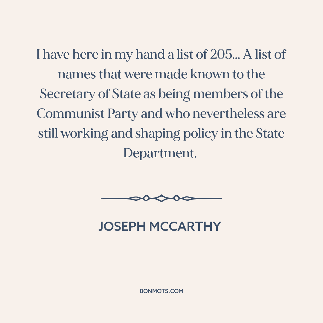I have here in my hand a list of 205... A list of names that were made known to the Secretary of State as being members of the Communist Party and who nevertheless are still working and shaping policy in the State Department.