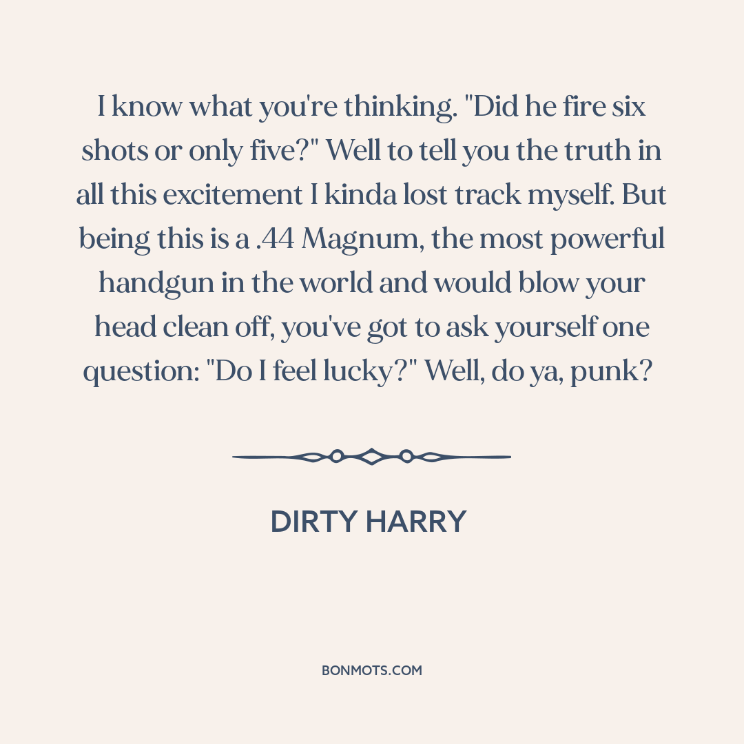 I know what you're thinking. "Did he fire six shots or only five?" Well to tell you the truth in all this excitement I kinda lost track myself. But being this is a .44 Magnum, the most powerful handgun in the world and would blow your head clean off, you've got to ask yourself one question: "Do I feel lucky?" Well, do ya, punk?