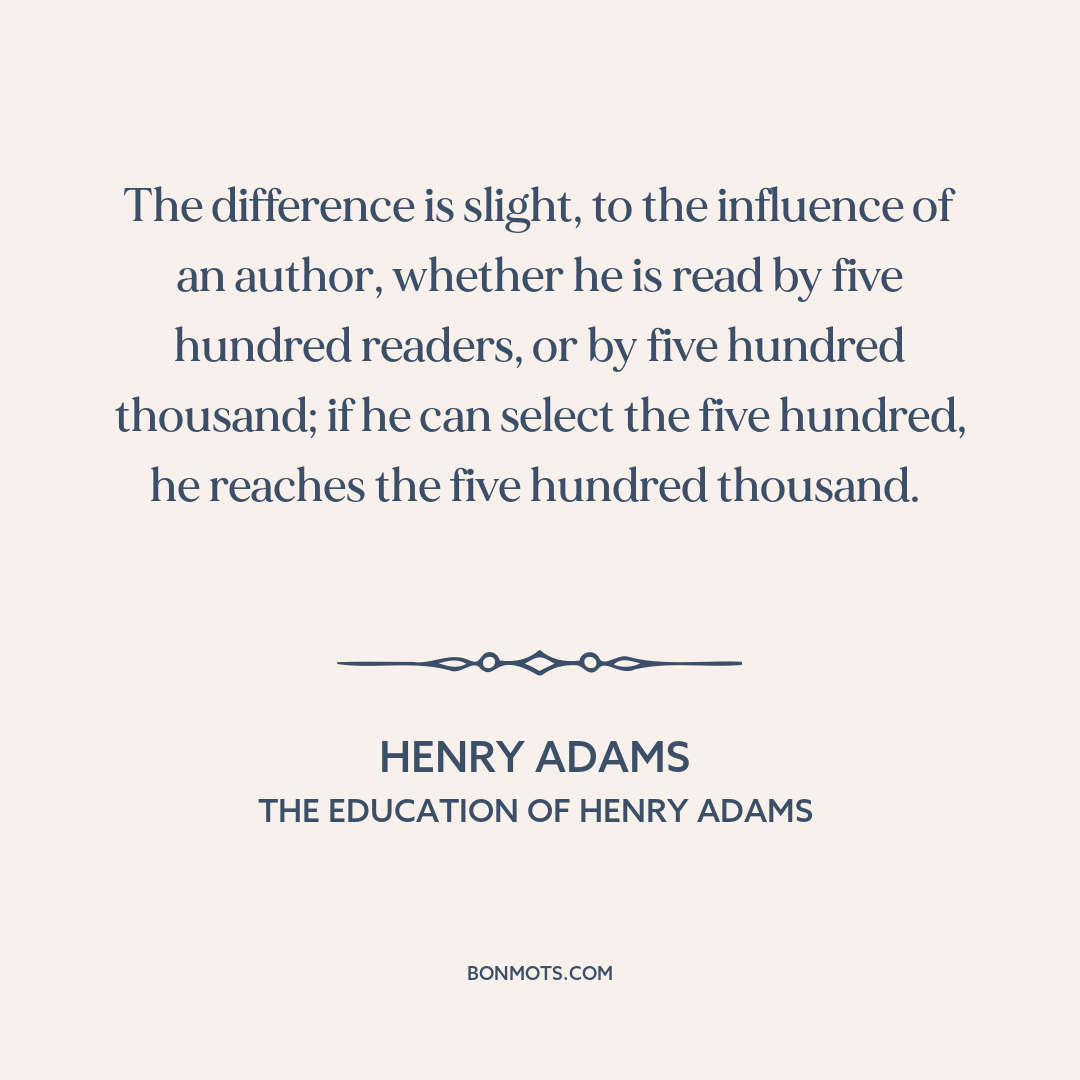 The difference is slight, to the influence of an author, whether he is read by five hundred readers, or by five hundred thousand; if he can select the five hundred, he reaches the five hundred thousand.