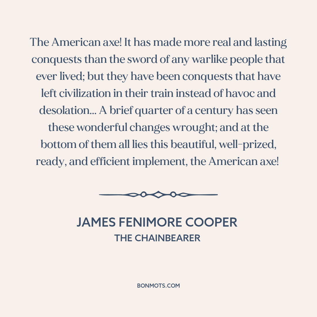 The American axe! It has made more real and lasting conquests than the sword of any warlike people that ever lived; but they have been conquests that have left civilization in their train instead of havoc and desolation... A brief quarter of a century has seen these wonderful changes wrought; and at the bottom of them all lies this beautiful, well-prized, ready, and efficient implement, the American axe!