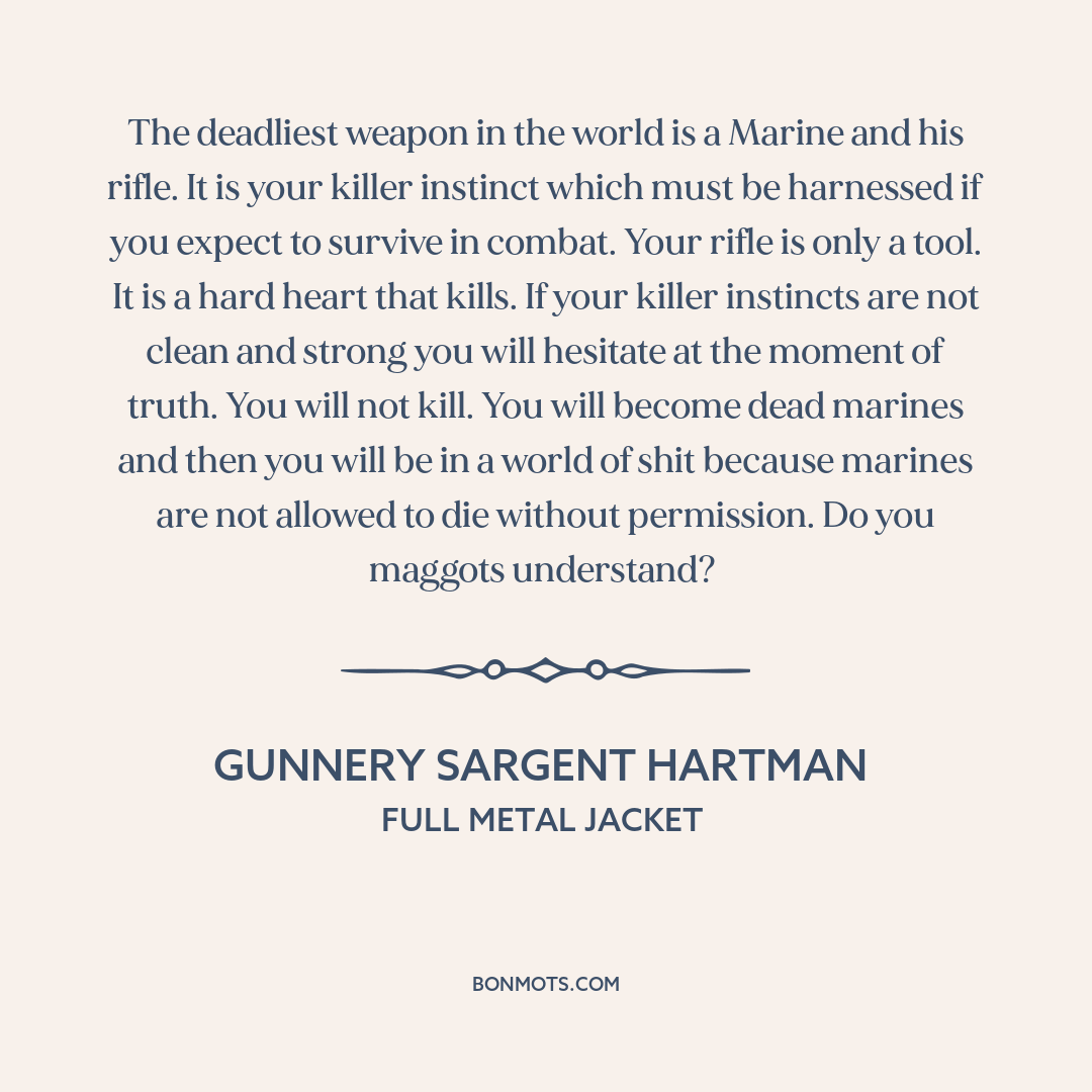 The deadliest weapon in the world is a Marine and his rifle. It is your killer instinct which must be harnessed if you expect to survive in combat. Your rifle is only a tool. It is a hard heart that kills. If your killer instincts are not clean and strong you will hesitate at the moment of truth. You will not kill. You will become dead marines and then you will be in a world of shit because marines are not allowed to die without permission. Do you maggots understand?
