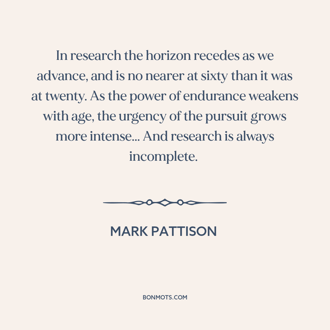 In research the horizon recedes as we advance, and is no nearer at sixty than it was at twenty. As the power of endurance weakens with age, the urgency of the pursuit grows more intense... And research is always incomplete.