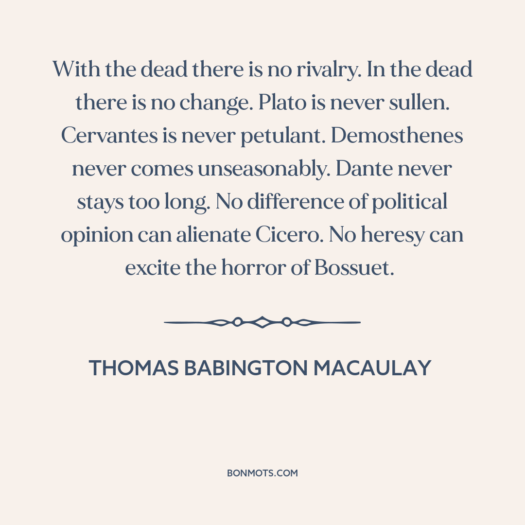 With the dead there is no rivalry. In the dead there is no change. Plato is never sullen. Cervantes is never petulant. Demosthenes never comes unseasonably. Dante never stays too long. No difference of political opinion can alienate Cicero. No heresy can excite the horror of Bossuet.