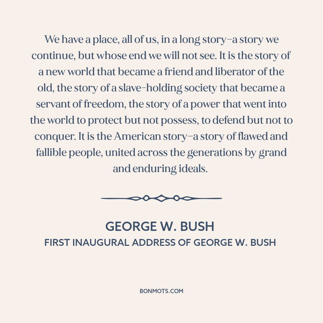 We have a place, all of us, in a long story—a story we continue, but whose end we will not see. It is the story of a new world that became a friend and liberator of the old, the story of a slave-holding society that became a servant of freedom, the story of a power that went into the world to protect but not possess, to defend but not to conquer. It is the American story—a story of flawed and fallible people, united across the generations by grand and enduring ideals.
