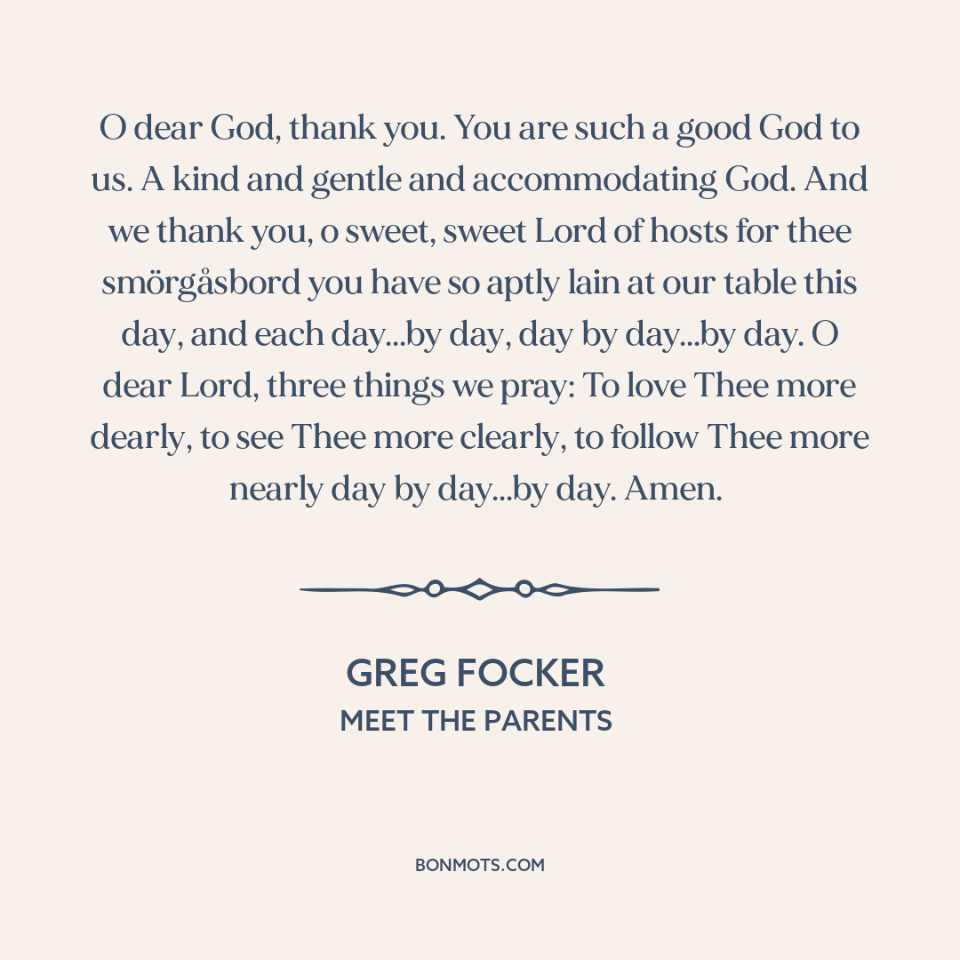 O dear God, thank you. You are such a good God to us. A kind and gentle and accommodating God. And we thank you, o sweet, sweet Lord of hosts for thee smörgåsbord you have so aptly lain at our table this day, and each day...by day, day by day...by day. O dear Lord, three things we pray: To love Thee more dearly, to see Thee more clearly, to follow Thee more nearly day by day...by day. Amen.