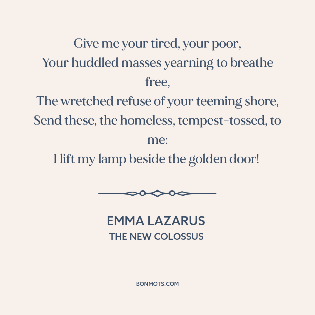 Lazarus, Emma. "The New Colossus." Statue of Liberty published catalog. c. 1883, I. 10.