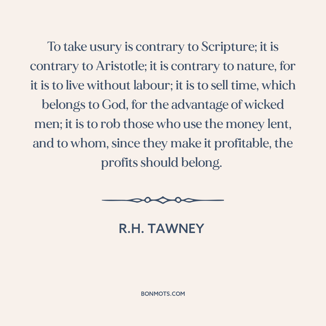 To take usury is contrary to Scripture; it is contrary to Aristotle; it is contrary to nature, for it is to live without labour; it is to sell time, which belongs to God, for the advantage of wicked men; it is to rob those who use the money lent, and to whom, since they make it profitable, the profits should belong.