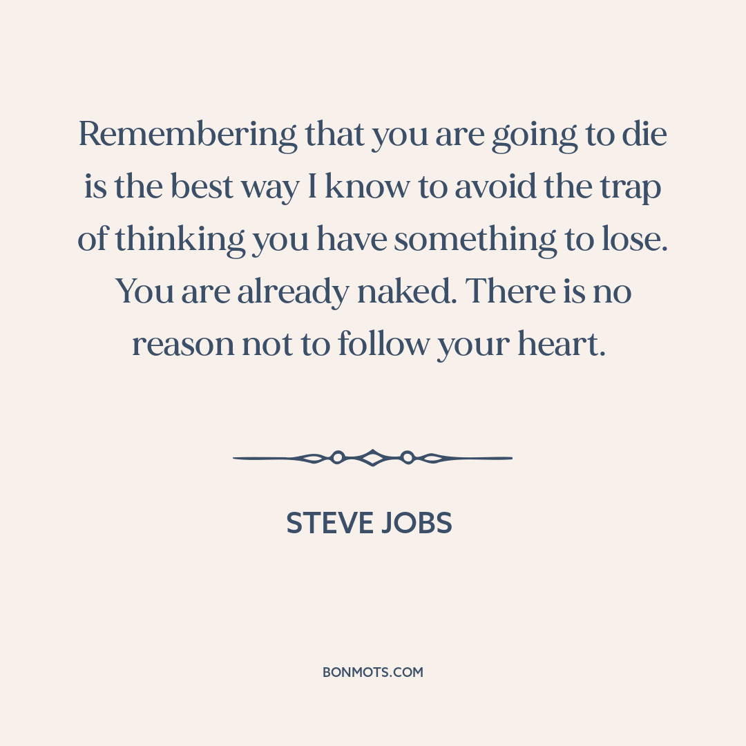 Remembering that you are going to die is the best way I know to avoid the trap of thinking you have something to lose. You are already naked. There is no reason not to follow your heart.