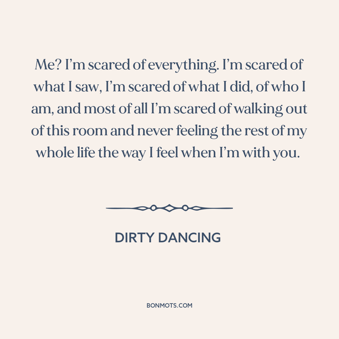 Me? I’m scared of everything. I’m scared of what I saw, I’m scared of what I did, of who I am, and most of all I’m scared of walking out of this room and never feeling the rest of my whole life the way I feel when I’m with you.