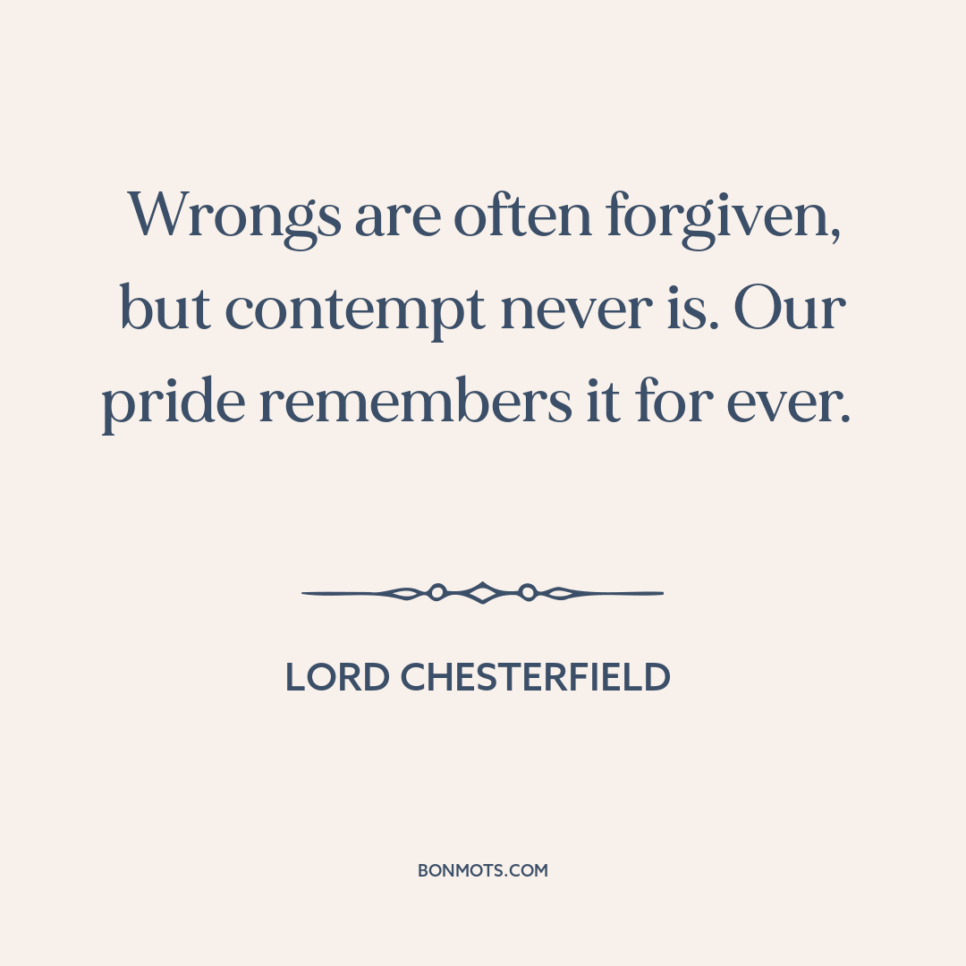 Wrongs are often forgiven, but contempt never is. Our pride remembers it for ever. Lord Chesterfield Read Chesterfield's Letters to His Son at Project Gutenberg Instagram sharing coming soon. Quote text and source copied to clipboard. Link to this quote copied to clipboard. More information about this quote Topic Forgiveness Contempt Author Lord Chesterfield Source Letters of Lord Chesterfield Medium Letter Language English Time 1748 1740s 18th century Occupation Politician Writer From United Kingdom Europe Authentication Score 3 More information on Authentication Score coming soon. Citation Stanhope, Philip Dormer. Letter to his son. 1 July 1748. Citation text copied to clipboard.