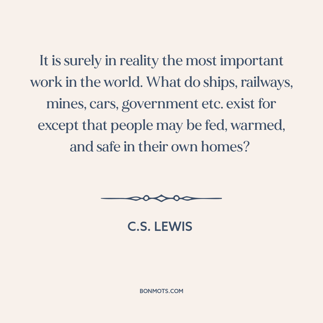 It is surely in reality the most important work in the world. What do ships, railways, mines, cars, government etc. exist for except that people may be fed, warmed, and safe in their own homes?