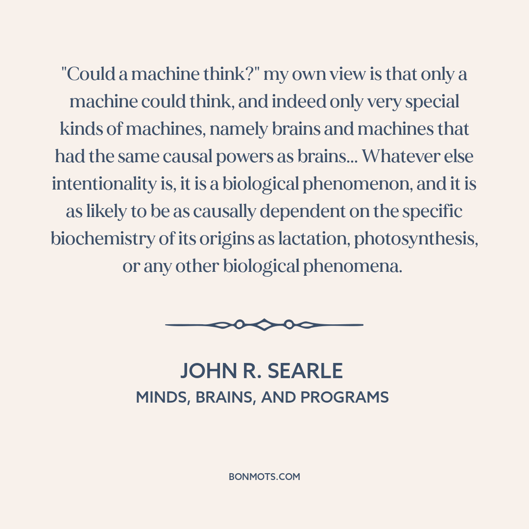 "Could a machine think?" my own view is that only a machine could think, and indeed only very special kinds of machines, namely brains and machines that had the same causal powers as brains... Whatever else intentionality is, it is a biological phenomenon, and it is as likely to be as causally dependent on the specific biochemistry of its origins as lactation, photosynthesis, or any other biological phenomena.