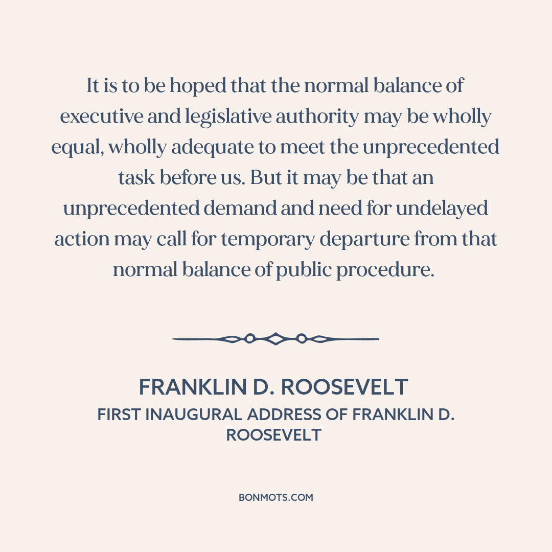 It is to be hoped that the normal balance of executive and legislative authority may be wholly equal, wholly adequate to meet the unprecedented task before us. But it may be that an unprecedented demand and need for undelayed action may call for temporary departure from that normal balance of public procedure.