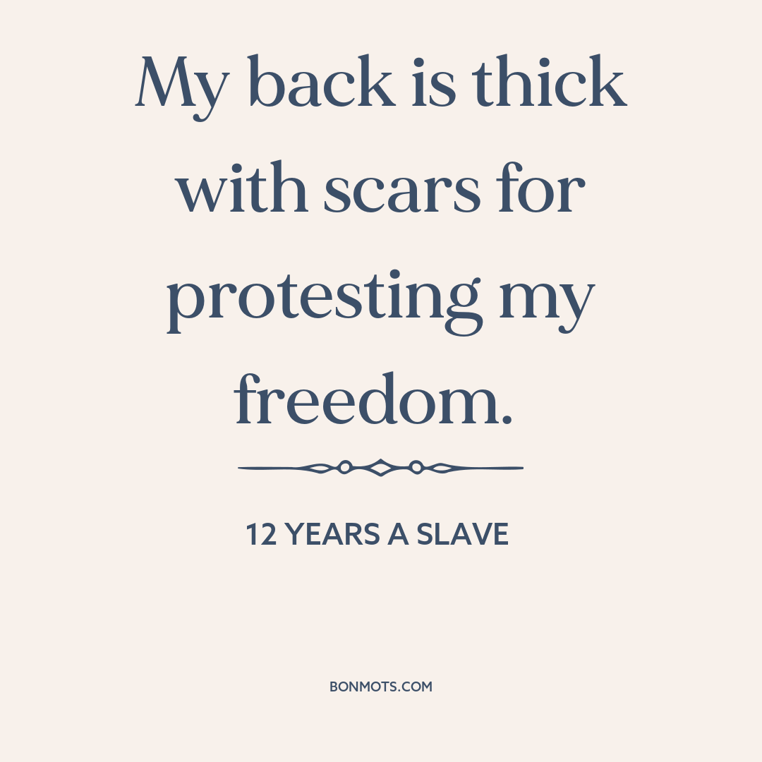 My back is thick with scars for protesting my freedom. 12 Years a Slave Watch 12 Years a Slave at Amazon Watch 12 Years a Slave at Amazon Instagram sharing coming soon. Quote text and source copied to clipboard. Link to this quote copied to clipboard. More information about this quote Topic Slavery Speaker Solomon Northup Actor Chiwetel Ejiofor Source 12 Years a Slave Medium Film Genre Historical drama (film) Drama (film) Historical drama Drama Language English Time 2013 2010s 21st century Authentication Score 3 More information on Authentication Score coming soon. Citation 12 Years a Slave. Directed by Steve McQueen, Plan B Entertainment/Regency Enterprises/ Film4 Productions/River Road Entertainment/Regency Enterprises, 2013. Citation text copied to clipboard.