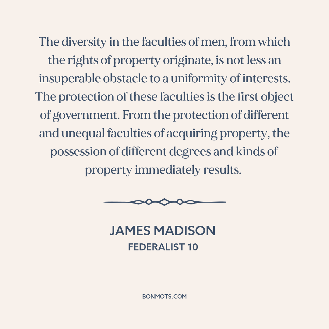 The diversity in the faculties of men, from which the rights of property originate, is not less an insuperable obstacle to a uniformity of interests. The protection of these faculties is the first object of government. From the protection of different and unequal faculties of acquiring property, the possession of different degrees and kinds of property immediately results.