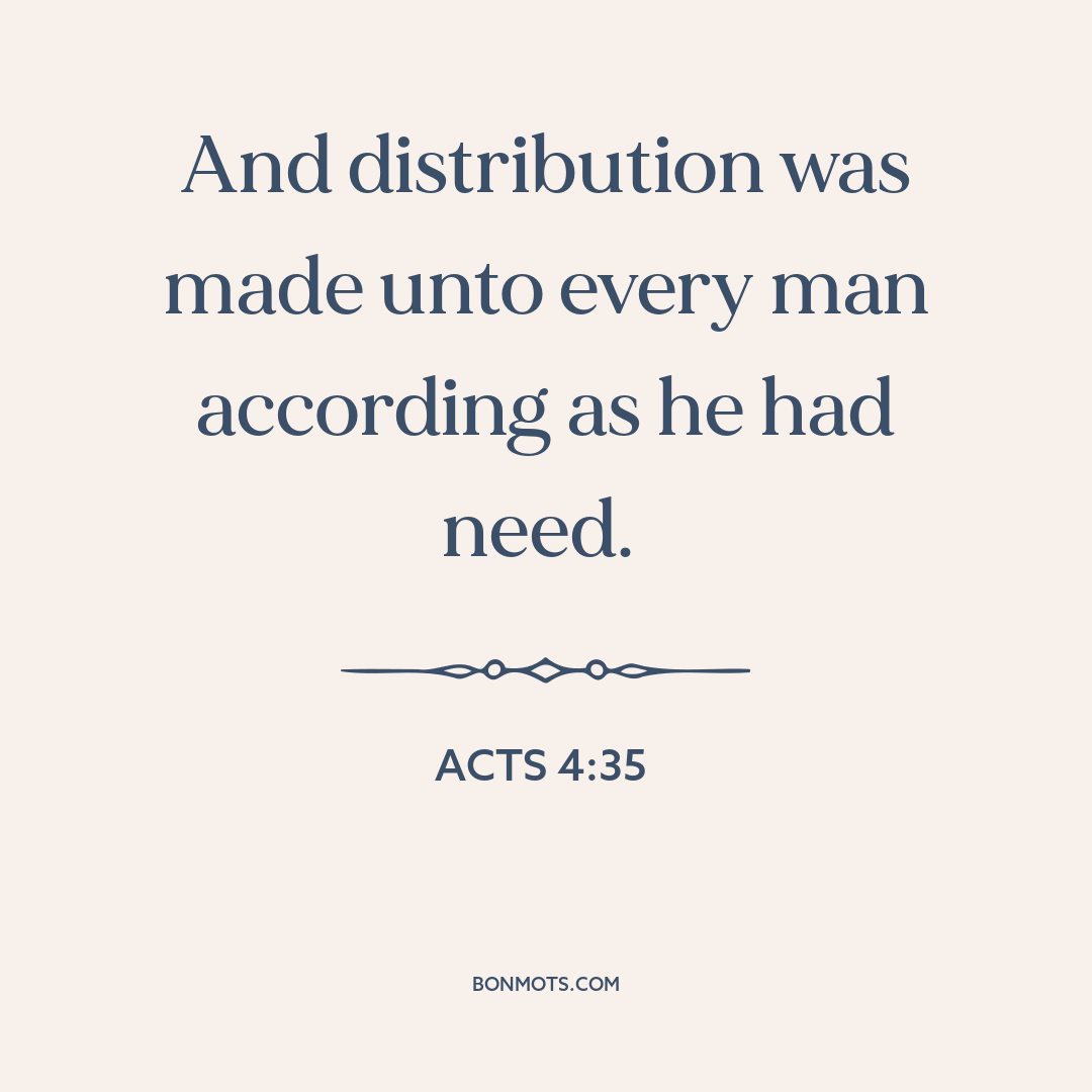 And distribution was made unto every man according as he had need. διεδίδετο δὲ ἑκάστῳ καθότι ἄν τις χρείαν εἶχεν. Acts 4:35 Buy the Bible (KJV) at Amazon Buy the Bible (KJV) at Amazon Read this verse at Bible Hub Instagram sharing coming soon. Quote text and source copied to clipboard. Link to this quote copied to clipboard. More information about this quote Topic Redistribution of resources Sharing Early Christians Source Book of Acts The Bible Medium Scripture Genre Religious literature Language Greek Time 62 60s 1st century Era Classical antiquity Authentication Score 3 More information on Authentication Score coming soon. Citation The Holy Bible: The King James Version. 1611. (Acts 4:35). Citation text copied to clipboard.