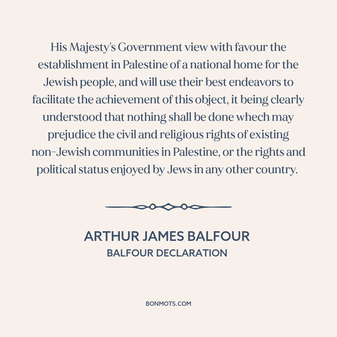 His Majesty's Government view with favour the establishment in Palestine of a national home for the Jewish people, and will use their best endeavors to facilitate the achievement of this object, it being clearly understood that nothing shall be done whech may prejudice the civil and religious rights of existing non-Jewish communities in Palestine, or the rights and political status enjoyed by Jews in any other country.