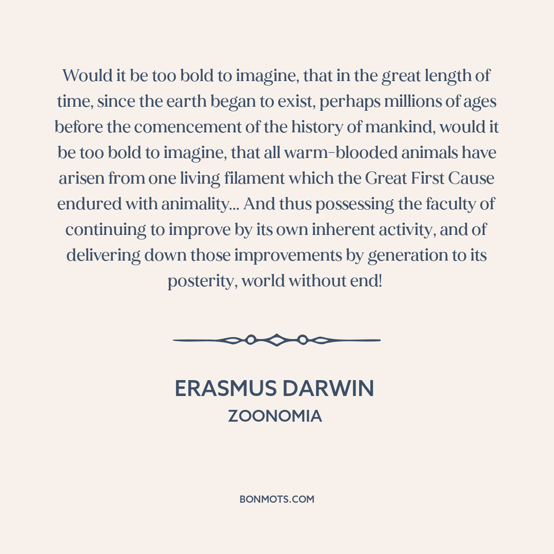 Would it be too bold to imagine, that in the great length of time, since the earth began to exist, perhaps millions of ages before the comencement of the history of mankind, would it be too bold to imagine, that all warm-blooded animals have arisen from one living filament which the Great First Cause endured with animality... And thus possessing the faculty of continuing to improve by its own inherent activity, and of delivering down those improvements by generation to its posterity, world without end!