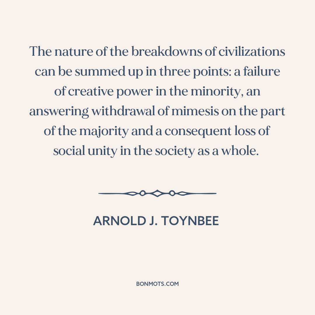 The nature of the breakdowns of civilizations can be summed up in three points: a failure of creative power in the minority, an answering withdrawal of mimesis on the part of the majority and a consequent loss of social unity in the society as a whole.