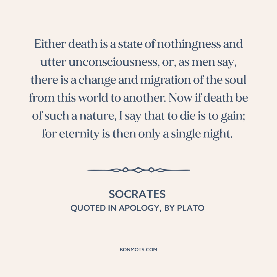 Either death is a state of nothingness and utter unconsciousness, or, as men say, there is a change and migration of the soul from this world to another. Now if death be of such a nature, I say that to die is to gain; for eternity is then only a single night.