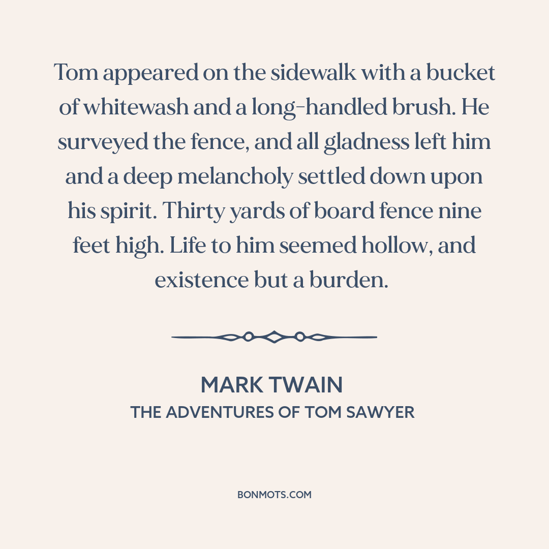 Tom appeared on the sidewalk with a bucket of whitewash and a long-handled brush. He surveyed the fence, and all gladness left him and a deep melancholy settled down upon his spirit. Thirty yards of board fence nine feet high. Life to him seemed hollow, and existence but a burden.