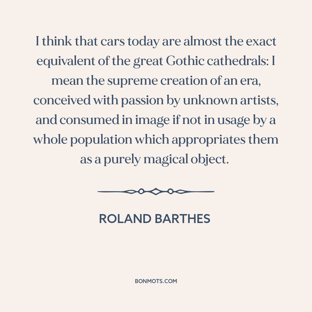 I think that cars today are almost the exact equivalent of the great Gothic cathedrals: I mean the supreme creation of an era, conceived with passion by unknown artists, and consumed in image if not in usage by a whole population which appropriates them as a purely magical object.