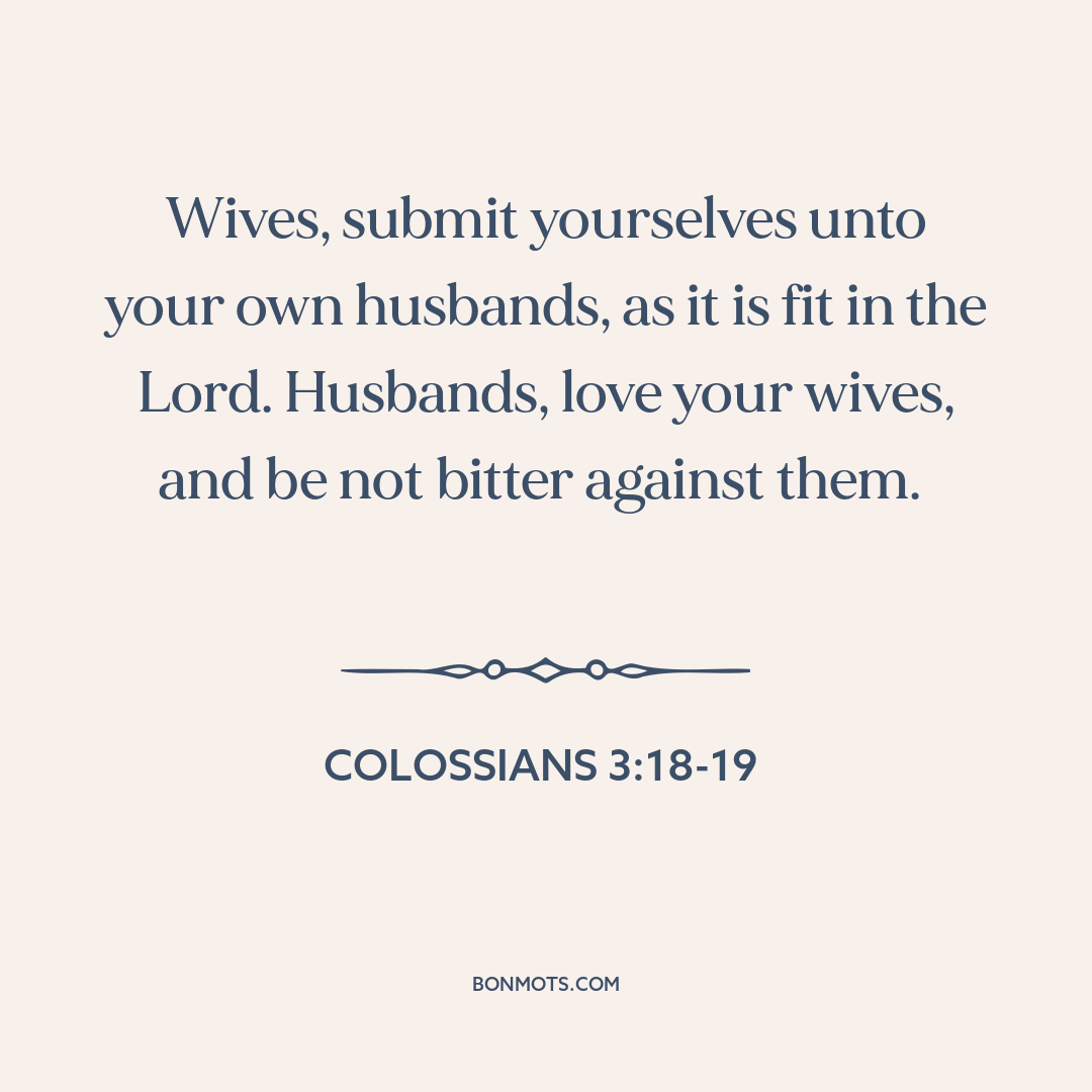 Wives, submit yourselves unto your own husbands, as it is fit in the Lord. Husbands, love your wives, and be not bitter against them.