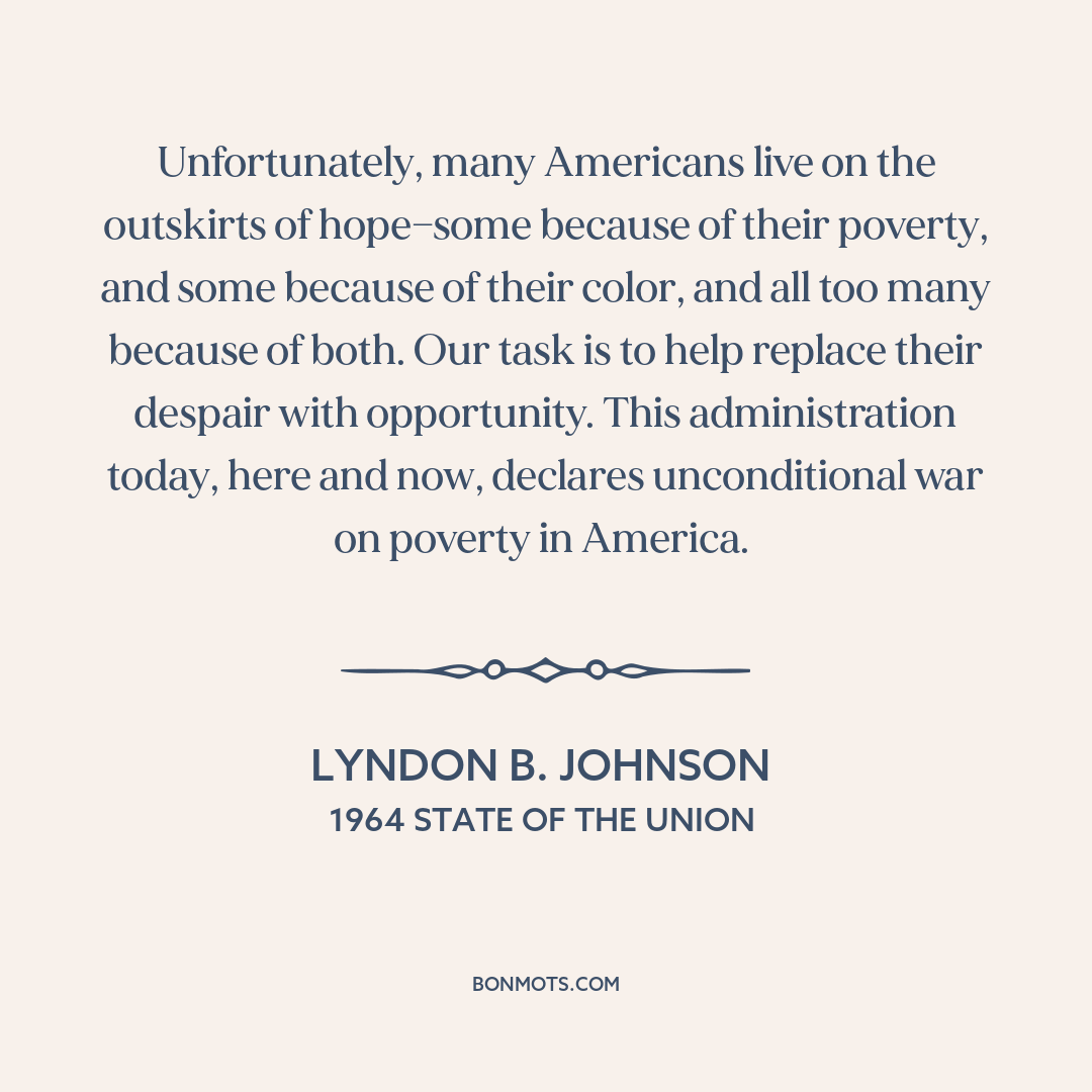 Unfortunately, many Americans live on the outskirts of hope—some because of their poverty, and some because of their color, and all too many because of both. Our task is to help replace their despair with opportunity. This administration today, here and now, declares unconditional war on poverty in America.