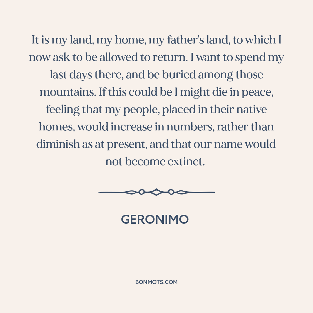 It is my land, my home, my father's land, to which I now ask to be allowed to return. I want to spend my last days there, and be buried among those mountains. If this could be I might die in peace, feeling that my people, placed in their native homes, would increase in numbers, rather than diminish as at present, and that our name would not become extinct.