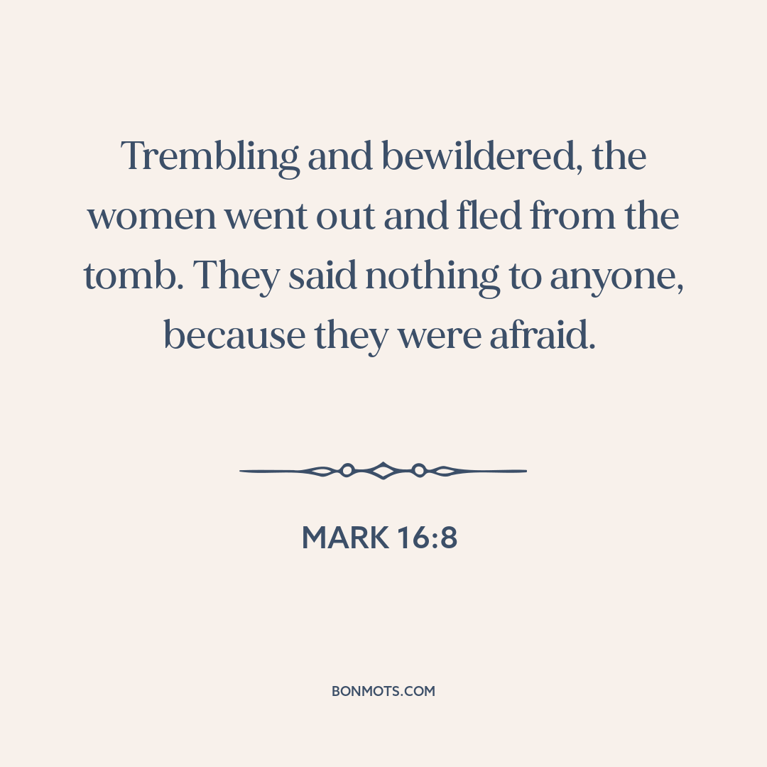 Trembling and bewildered, the women went out and fled from the tomb. They said nothing to anyone, because they were afraid.
