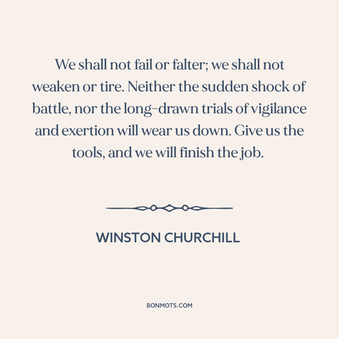 We shall not fail or falter; we shall not weaken or tire. Neither the sudden shock of battle, nor the long-drawn trials of vigilance and exertion will wear us down. Give us the tools, and we will finish the job.