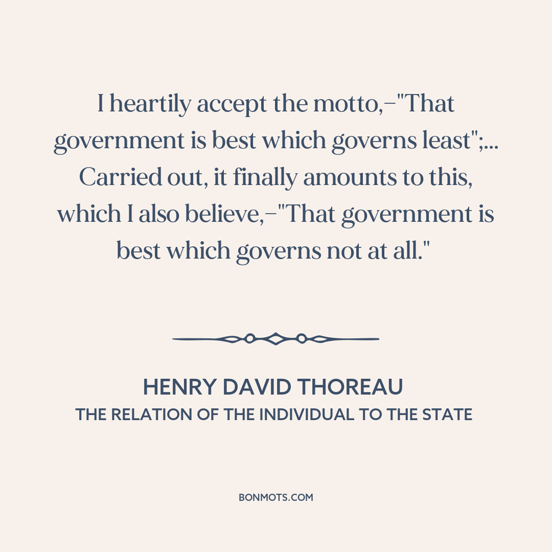 I heartily accept the motto,—"That government is best which governs least";... Carried out, it finally amounts to this, which I also believe,—"That government is best which governs not at all."