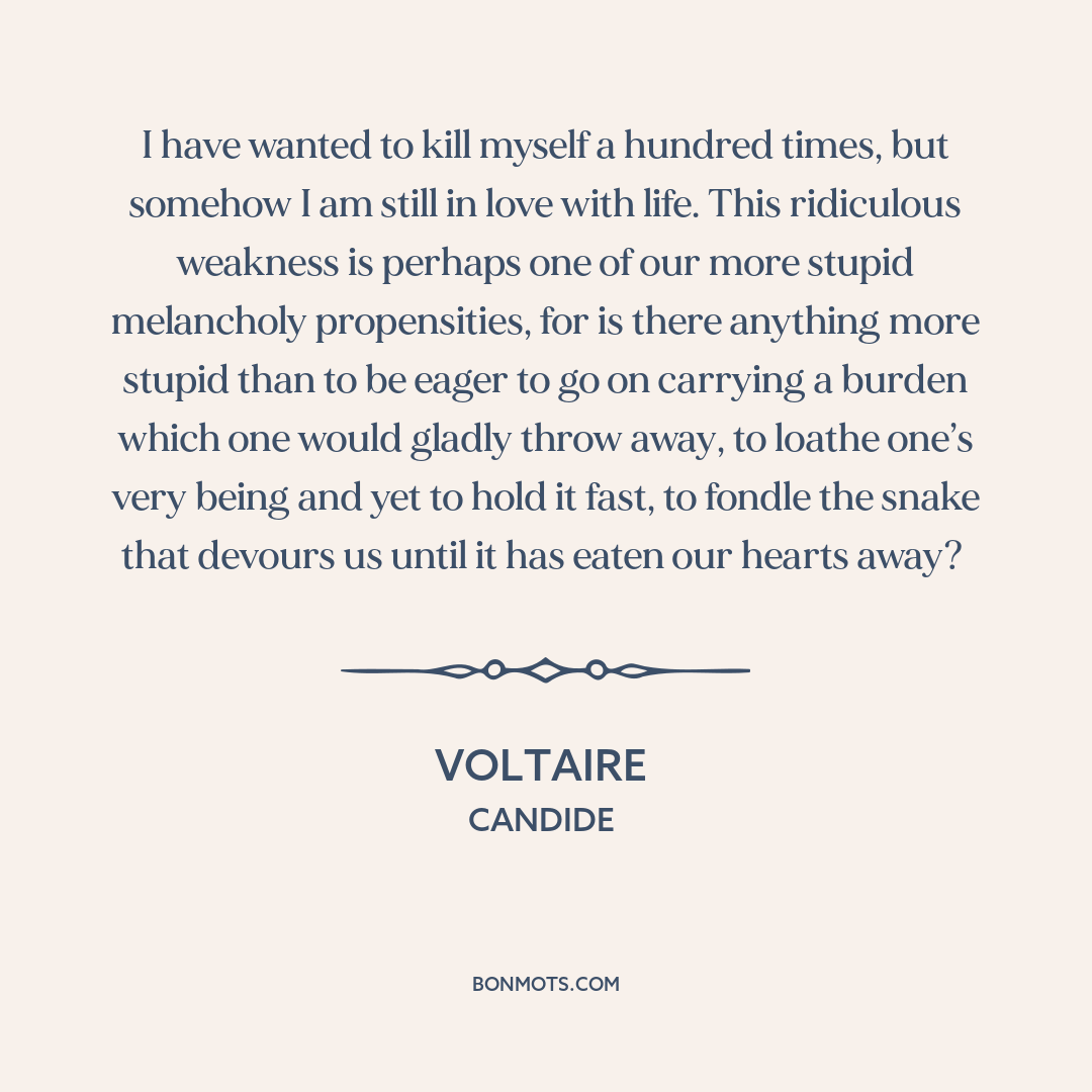 I have wanted to kill myself a hundred times, but somehow I am still in love with life. This ridiculous weakness is perhaps one of our more stupid melancholy propensities, for is there anything more stupid than to be eager to go on carrying a burden which one would gladly throw away, to loathe one’s very being and yet to hold it fast, to fondle the snake that devours us until it has eaten our hearts away?