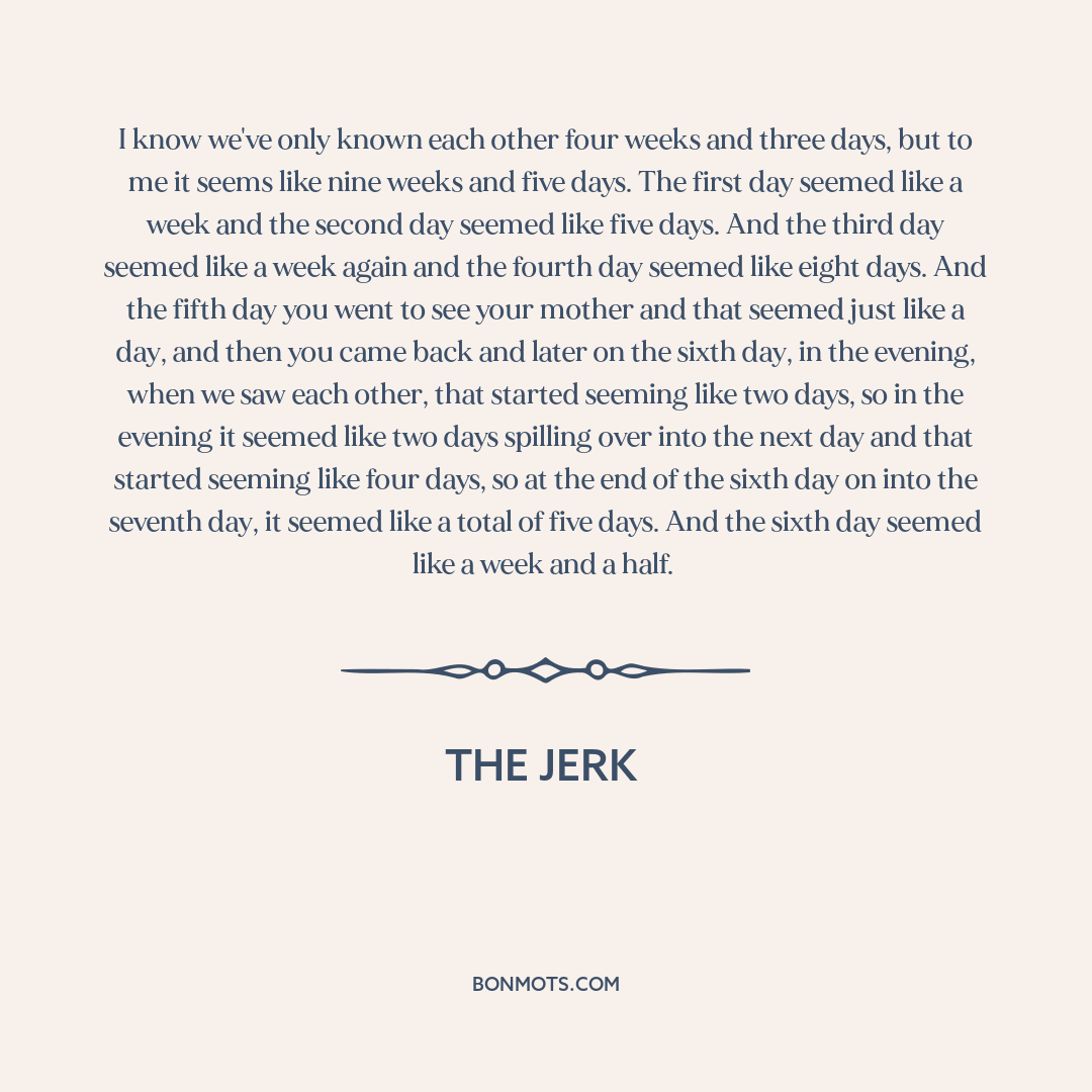 I know we've only known each other four weeks and three days, but to me it seems like nine weeks and five days. The first day seemed like a week and the second day seemed like five days. And the third day seemed like a week again and the fourth day seemed like eight days. And the fifth day you went to see your mother and that seemed just like a day, and then you came back and later on the sixth day, in the evening, when we saw each other, that started seeming like two days, so in the evening it seemed like two days spilling over into the next day and that started seeming like four days, so at the end of the sixth day on into the seventh day, it seemed like a total of five days. And the sixth day seemed like a week and a half.