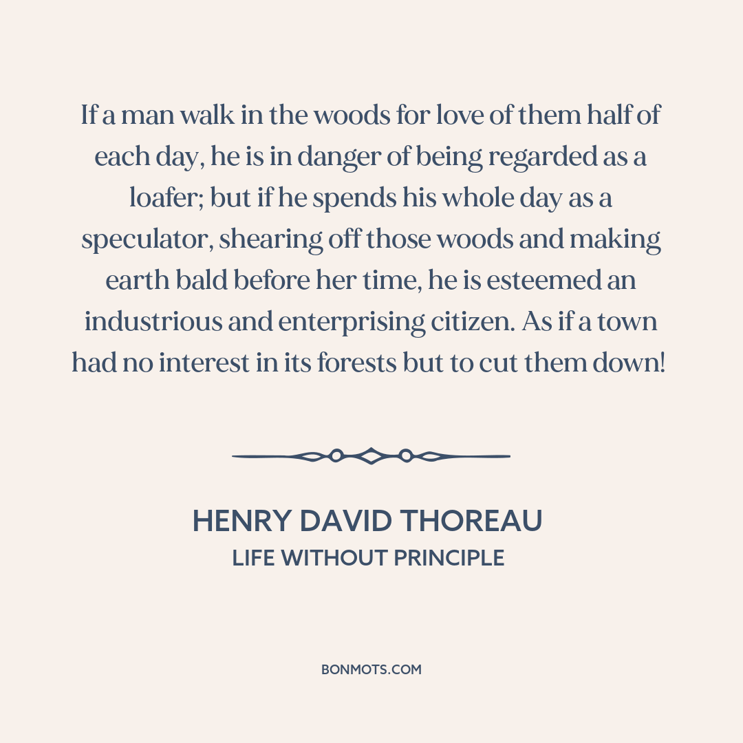 If a man walk in the woods for love of them half of each day, he is in danger of being regarded as a loafer; but if he spends his whole day as a speculator, shearing off those woods and making earth bald before her time, he is esteemed an industrious and enterprising citizen. As if a town had no interest in its forests but to cut them down!