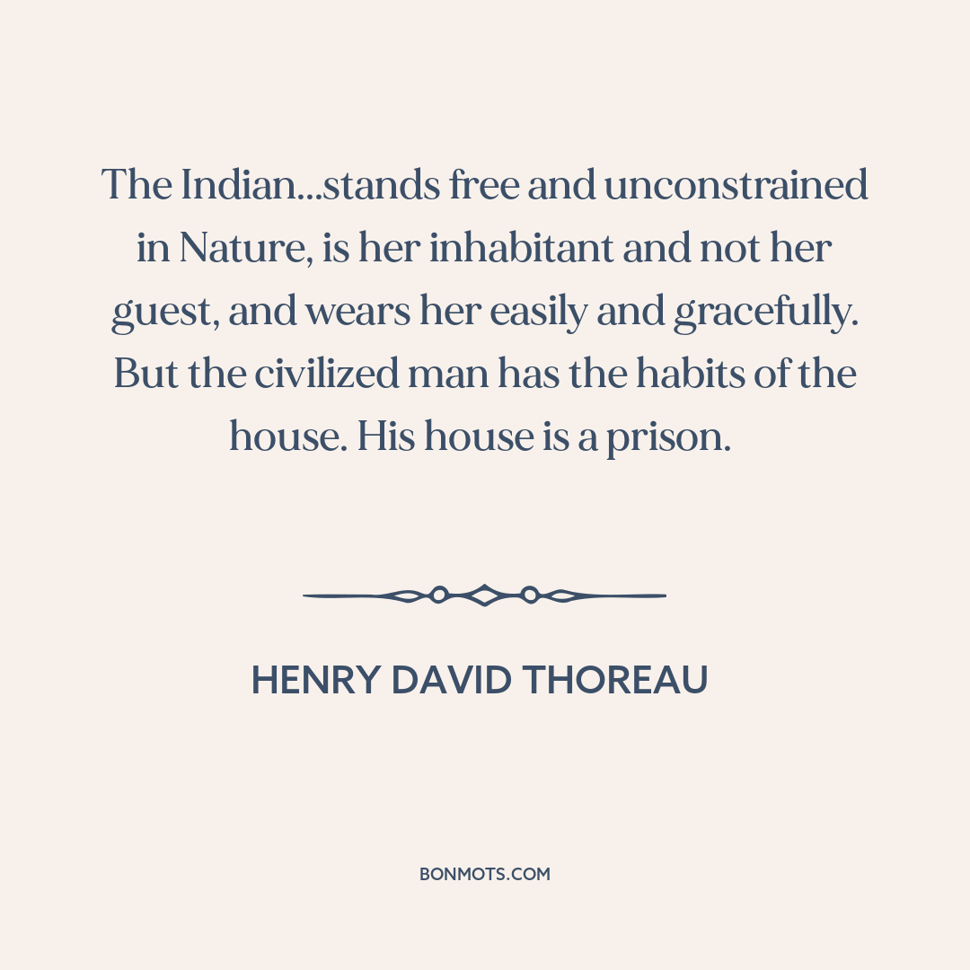 The Indian...stands free and unconstrained in Nature, is her inhabitant and not her guest, and wears her easily and gracefully. But the civilized man has the habits of the house. His house is a prison.