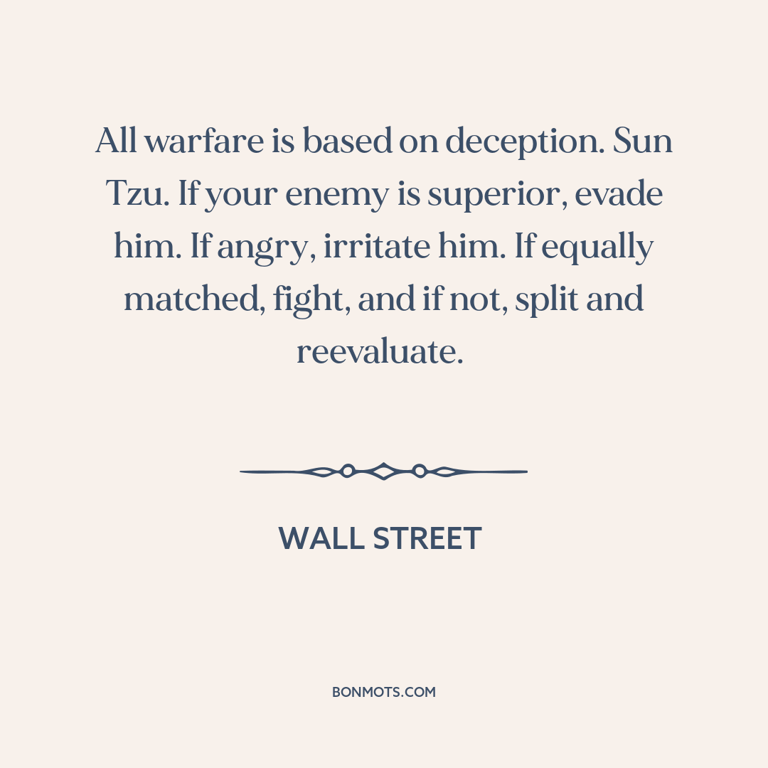 All warfare is based on deception. Sun Tzu. If your enemy is superior, evade him. If angry, irritate him. If equally matched, fight, and if not, split and reevaluate.