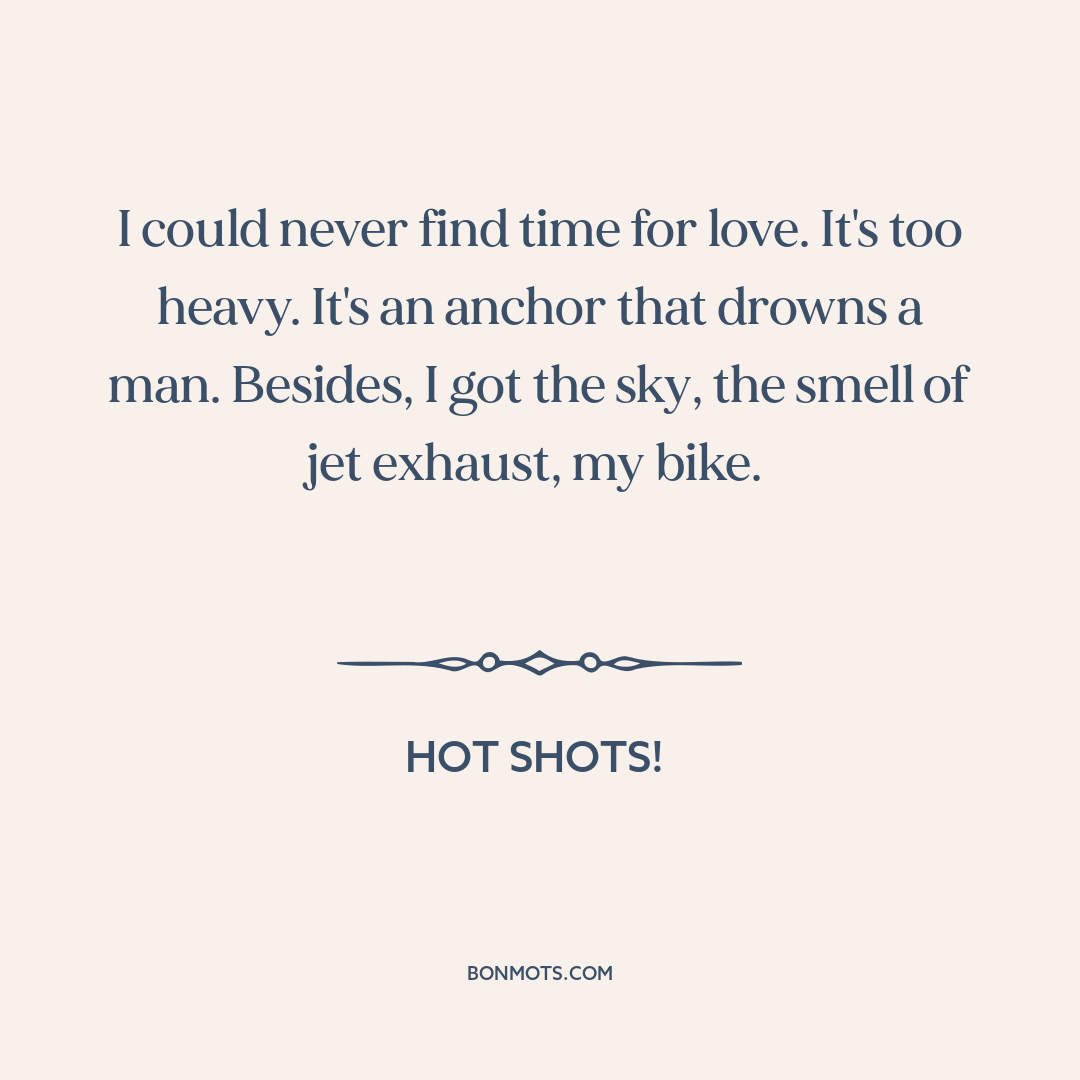 I could never find time for love. It's too heavy. It's an anchor that drowns a man. Besides, I got the sky, the smell of jet exhaust, my bike.