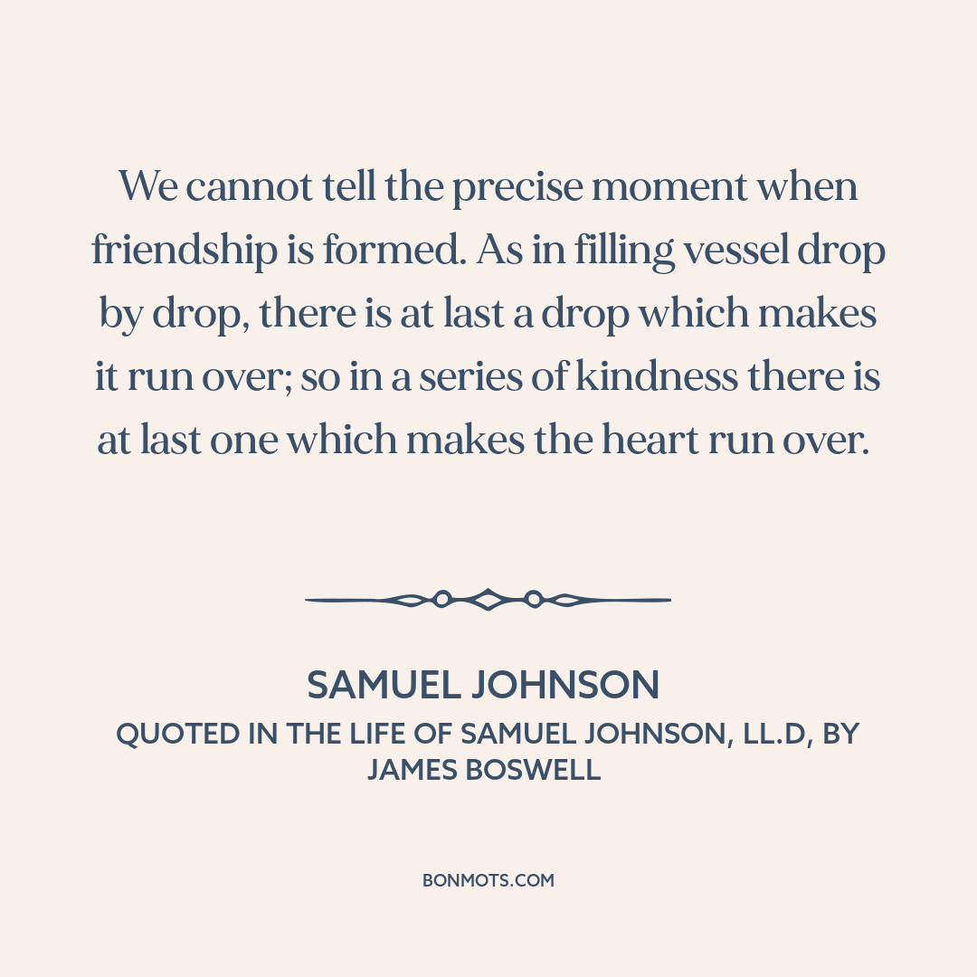 We cannot tell the precise moment when friendship is formed. As in filling vessel drop by drop, there is at last a drop which makes it run over; so in a series of kindness there is at last one which makes the heart run over.
