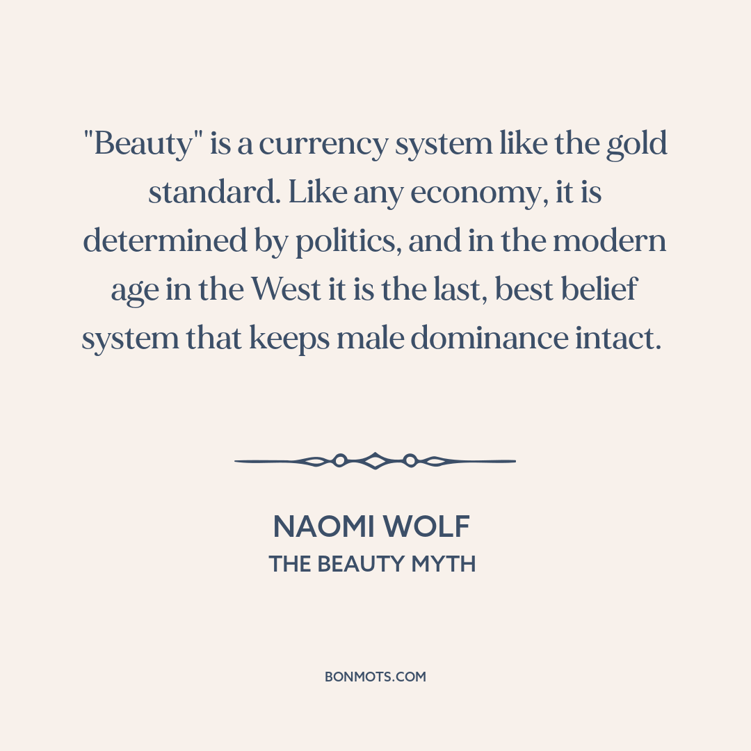 "Beauty" is a currency system like the gold standard. Like any economy, it is determined by politics, and in the modern age in the West it is the last, best belief system that keeps male dominance intact.