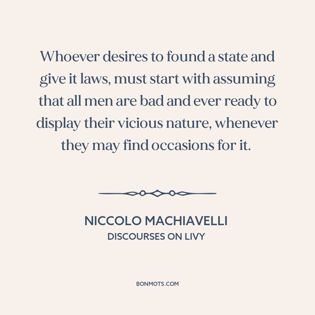 Whoever desires to found a state and give it laws, must start with assuming that all men are bad and ever ready to display their vicious nature, whenever they may find occasions for it.