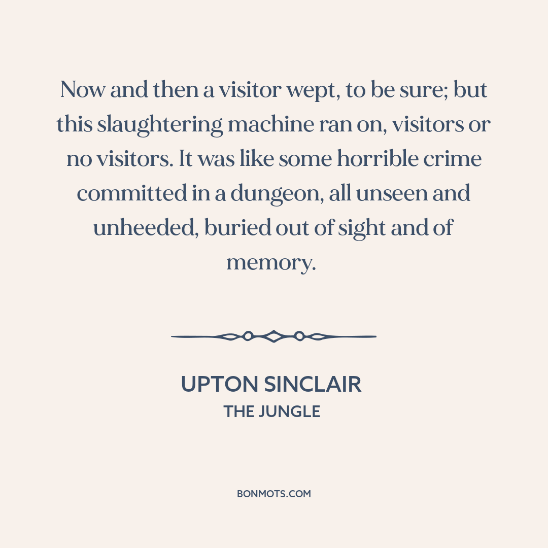Now and then a visitor wept, to be sure; but this slaughtering machine ran on, visitors or no visitors. It was like some horrible crime committed in a dungeon, all unseen and unheeded, buried out of sight and of memory.