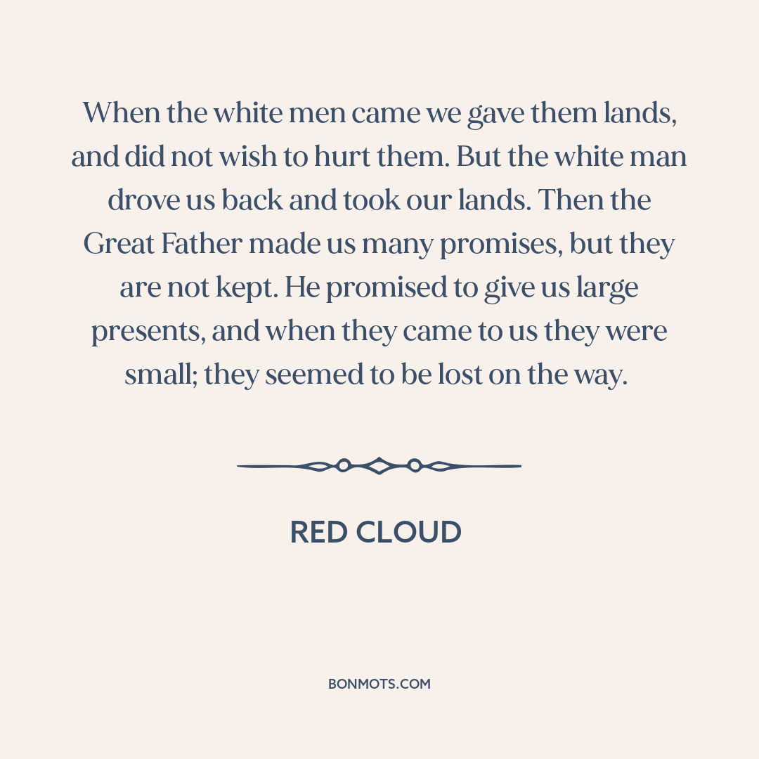 When the white men came we gave them lands, and did not wish to hurt them. But the white man drove us back and took our lands. Then the Great Father made us many promises, but they are not kept. He promised to give us large presents, and when they came to us they were small; they seemed to be lost on the way.