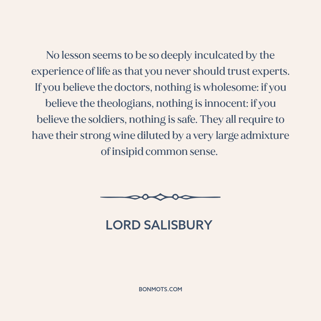 No lesson seems to be so deeply inculcated by the experience of life as that you never should trust experts. If you believe the doctors, nothing is wholesome: if you believe the theologians, nothing is innocent: if you believe the soldiers, nothing is safe. They all require to have their strong wine diluted by a very large admixture of insipid common sense.
