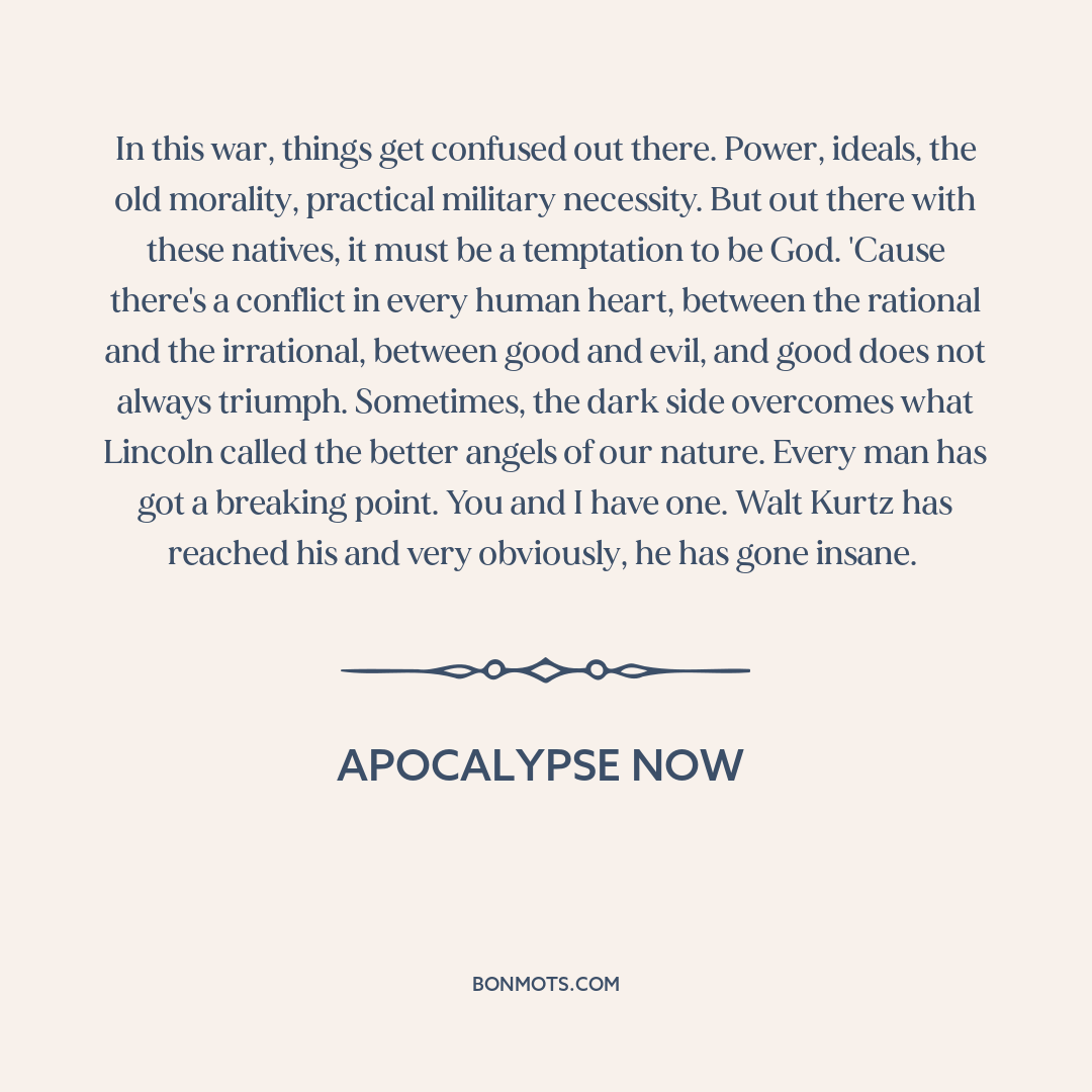 In this war, things get confused out there. Power, ideals, the old morality, practical military necessity. But out there with these natives, it must be a temptation to be God. 'Cause there's a conflict in every human heart, between the rational and the irrational, between good and evil, and good does not always triumph. Sometimes, the dark side overcomes what Lincoln called the better angels of our nature. Every man has got a breaking point. You and I have one. Walt Kurtz has reached his and very obviously, he has gone insane.